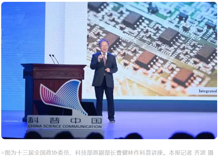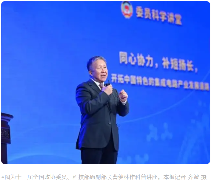 “芯片問題是事關百年發展的長期戰略問題,不是短期應急問題,必須持之以恒去發展。”“要充分發揮制度優勢,集中優勢隊伍持續攻關。”“要敢于開辟新賽道,打造新生態,推進‘再全球化’。”……9月25日下午,寬敞明亮的全國政協禮堂里,十三屆全國政協委員、教科衛體委員會副主任曹健林正站在舞臺中央巨大的顯示屏前,以“同心協力,補短揚長,開拓中國特色的集成電路產業發展道路”為題,為坐在臺下的全國政協委員、地方政協委員、高校學生、科研工作者等700余名觀眾作科普講座。