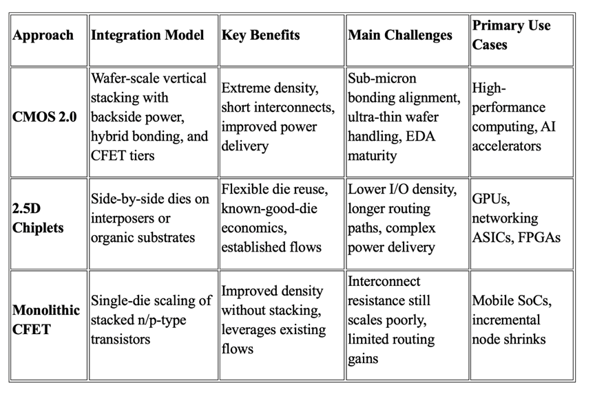CMOS 2.0 并非擴(kuò)大規(guī)模的唯一策略。代工廠和系統(tǒng)公司也在大力投資其他替代方案,每種方案都有各自的優(yōu)勢(shì)和利弊。
