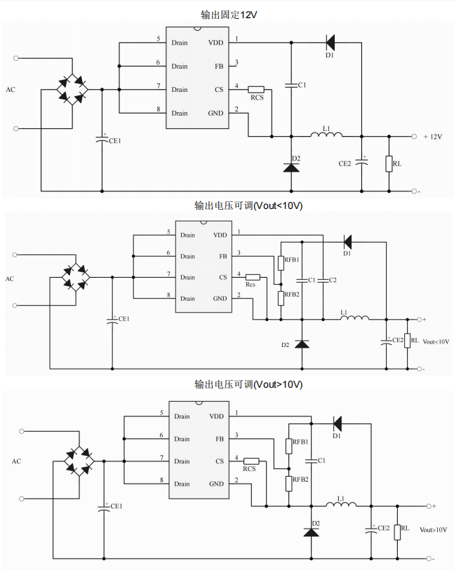 主要特點:集成 500V 高壓啟動電路;多模式控制、無異音工作;支持降壓和升降壓拓撲;默認 12V 輸出( FB 腳懸空);待機功耗低于 50mW;良好的線性調整率和負載調整率;集成軟啟動電路;內部保護功能 :過載保護 (OLP);逐周期電流限制 (OCP);輸出過壓保護 (OVP)Ø;VDD 過壓、欠壓和電壓箝位保護