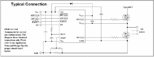 •主要特點:浮動通道設計用于自啟動操作,完全工作到+ 600v,可承受負瞬態電壓,柵極驅動供電范圍從10v到20v,所有通道欠壓鎖定,過流關斷關閉所有六個驅動器,獨立的3個半橋驅動器,所有通道匹配的傳播延遲,交叉傳導防止邏輯,低側輸出與輸入失相。3.3 V邏輯兼容,低電壓柵極驅動,抗噪性更好,外部可編程延遲,故障自動清除,所有部件均無鉛